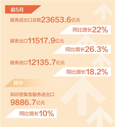 知識(shí)密集型服務(wù)貿(mào)易穩(wěn)定增長(zhǎng)。前5月,知識(shí)密集型服務(wù)進(jìn)出口9886.7億元,同比增長(zhǎng)10%。其中,知識(shí)密集型服務(wù)出口5602.4億元,增長(zhǎng)13.6%;出口增長(zhǎng)較快的領(lǐng)域是電信計(jì)算機(jī)和信息服務(wù)、其他商業(yè)服務(wù),分別增長(zhǎng)18.5%、13.2%。知識(shí)密集型服務(wù)進(jìn)口4284.3億元,增長(zhǎng)5.6%;進(jìn)口增長(zhǎng)較快的領(lǐng)域是保險(xiǎn)服務(wù),增速達(dá)74.2%。