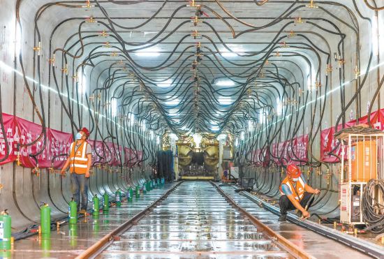 記者在施工現(xiàn)場看到,這臺特制的矩形頂管機,寬6.9米、高4.9米,采用6刀盤切削土方,隧道一次成型,施工安全得到有效保障,質(zhì)量顯著提高。隨著掘進設(shè)備刀盤快速轉(zhuǎn)動,前方的砂石和土層被攪碎排出,打通施工空間。混凝土預(yù)制管片被吊裝設(shè)備運至地下,放在安裝位置上。