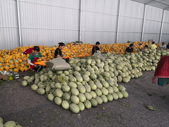 隆堯縣固城鎮(zhèn)小孟村哈密瓜收獲,瓜農(nóng)們正在挑揀包裝。 任學(xué)麗攝