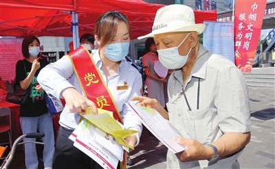 7月13日上午,天津市和平區(qū)濱江道樂賓百貨門前,市第十二次黨代會(huì)精神宣講展位彩旗招展,群眾絡(luò)繹不絕。來自衛(wèi)健、科技、政法、交通、公共服務(wù)、社會(huì)組織等方面50多個(gè)各級(jí)各類的為民服務(wù)窗口型“巾幗文明崗”“巾幗建功先進(jìn)集體”志愿者齊聚,以學(xué)習(xí)宣傳貫徹市第十二次黨代會(huì)精神暨“迎盛會(huì)、鑄忠誠(chéng)、強(qiáng)擔(dān)當(dāng)、創(chuàng)業(yè)績(jī)”巾幗文明崗為群眾服務(wù)活動(dòng)為主題,開展多項(xiàng)便民服務(wù)。