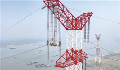 國網安徽電力施工人員在200多米的高空,進行白鶴灘—江蘇工程的跨長江導線架設施工。張遠溪攝(人民視覺)