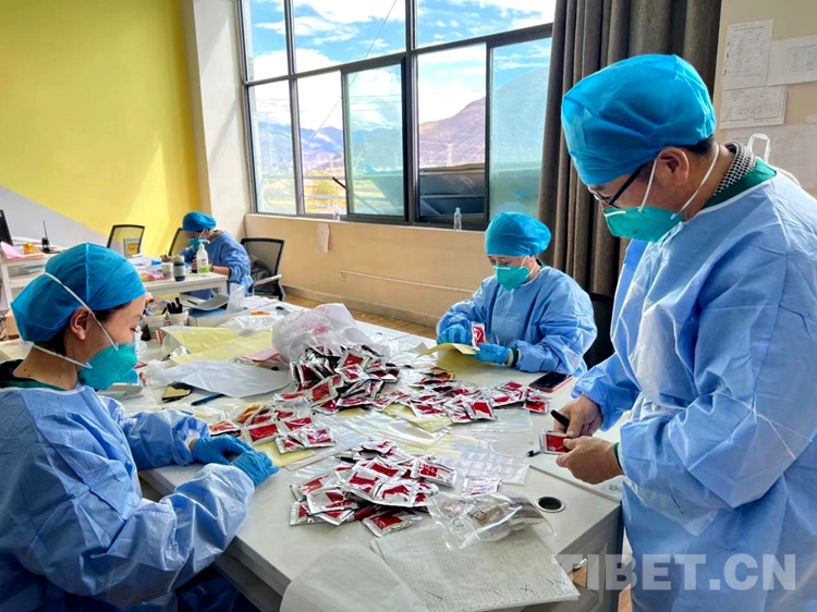 圖為拉薩市第二座方艙醫(yī)院藥劑科醫(yī)護人員們?yōu)樾氯腭v的患者準(zhǔn)備藏藥 攝影:次仁卓瑪