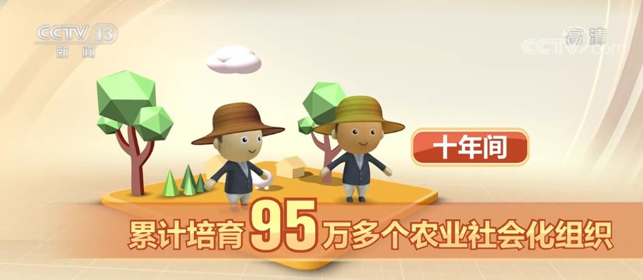 十年間,累計(jì)培育95萬多個(gè)農(nóng)業(yè)社會(huì)化組織,服務(wù)面積近17億畝次,服務(wù)帶動(dòng)小農(nóng)超過7800萬戶。全國農(nóng)作物耕種收綜合機(jī)械化水平從57%提高到72%以上,水稻、玉米、小麥三大糧食作物機(jī)械化率分別超過85%、90%和97%。