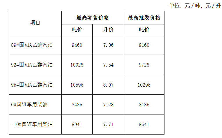 安徽省汽柴油最高零售和批發(fā)價(jià)格表