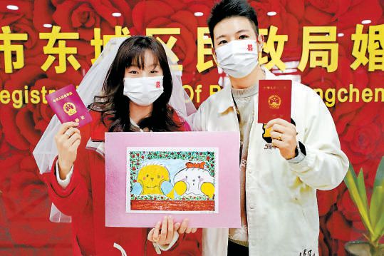 昨天7時(shí)10分,新人于博毅和丘一諾就趕到了東城區(qū)婚姻登記事務(wù)中心。于博毅家住房山,丘一諾住在豐臺(tái),兩人特意起了個(gè)大早,如愿成為當(dāng)天的“1號(hào)新人”。“今天是我們?cè)谝黄鸬牡?年6個(gè)月零6天?!眱晌恍氯艘蕾嗽谝黄?,眼中都是笑意。為了留下美好瞬間,準(zhǔn)新娘丘一諾給自己精心打扮了一下,她頭戴白紗,手里捧著一束海芋?!昂S蟮脑⒁馐谴松挥?。”她和于博毅相識(shí)多年,大學(xué)期間二人經(jīng)歷了好幾年異地戀,回到北京后才終于修成正果。