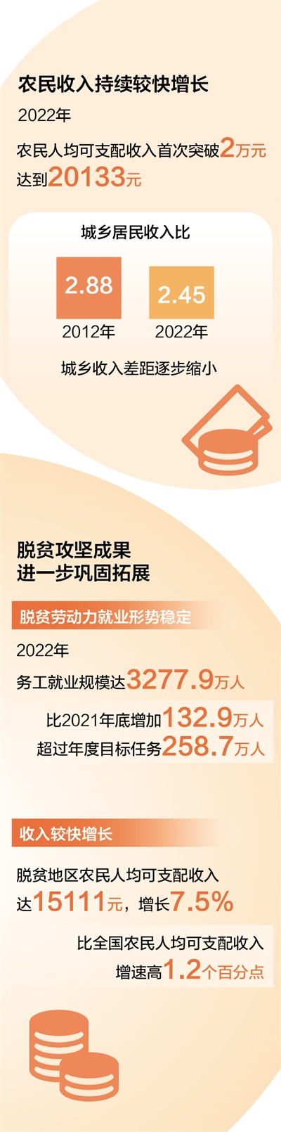 增加農(nóng)民收入是“三農(nóng)”工作的中心任務(wù)。2022年,農(nóng)民人均可支配收入首次突破2萬(wàn)元,城鄉(xiāng)居民收入比從2012年的2.88下降到2022年的2.45,城鄉(xiāng)收入差距逐步縮小?!耙惨吹剑?dāng)前農(nóng)民收入增速有所放緩,增收動(dòng)能有所減弱。必須高度重視,拿出長(zhǎng)短結(jié)合、務(wù)實(shí)管用的硬措施,拓寬農(nóng)民增收致富渠道?!敝醒朕r(nóng)辦專職副主任、農(nóng)業(yè)農(nóng)村部黨組成員吳宏耀說(shuō)。對(duì)此,今年中央一號(hào)文件在穩(wěn)定就業(yè)、經(jīng)營(yíng)增效、挖潛財(cái)產(chǎn)收入以及拓展轉(zhuǎn)移收入等方面作出相關(guān)部署,努力讓農(nóng)民腰包越來(lái)越鼓,日子越過(guò)越紅火。