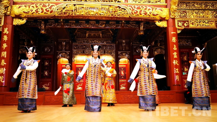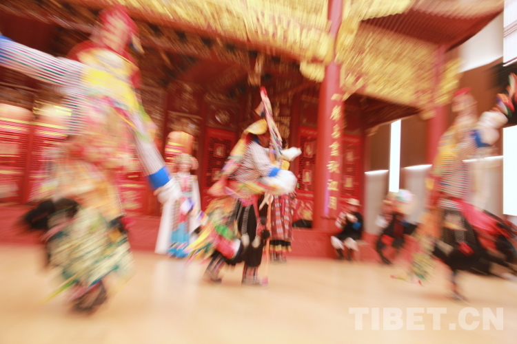 拉薩市城關區(qū)娘熱民間藝術團在藏戲這一非物質(zhì)文化遺產(chǎn)瑰寶的傳承中碩果累累,擁有西藏自治區(qū)級、拉薩市級和拉薩市城關區(qū)級多位非遺傳承人,是西藏自治區(qū)100多個民間劇團中唯一一個能夠完整表演“八大藏戲”的團體。圖為拉薩市城關區(qū)娘熱民間藝術團表演的藏戲開場《溫巴頓》片段 攝影:劉莉