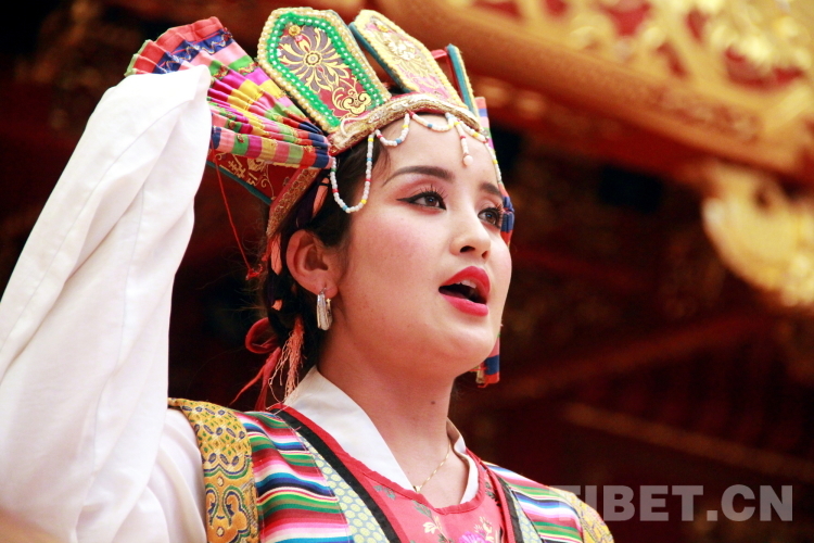 圖為拉薩市城關區(qū)娘熱民間藝術團演員洛桑卓瑪表演藏戲開場《溫巴頓》片段 攝影:劉莉