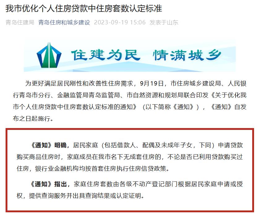 人民網(wǎng)濟南9月20日電 為更好滿足居民剛性和改善性住房需求,9月19日,青島市住房城鄉(xiāng)建設(shè)局、人民銀行青島市分行、金融監(jiān)管局青島監(jiān)管局、市自然資源和規(guī)劃局聯(lián)合印發(fā)《關(guān)于優(yōu)化我市個人住房貸款中住房套數(shù)認(rèn)定標(biāo)準(zhǔn)的通知》(以下簡稱《通知》),《通知》自發(fā)布之日起施行。