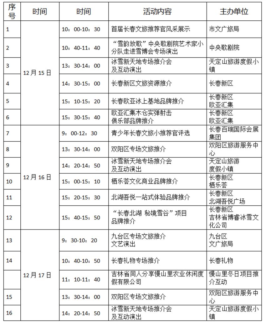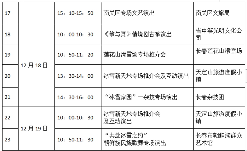 另外,12月15—19日,3號(hào)館—冰雪長(zhǎng)春主題館各個(gè)時(shí)間段都有演出和推介活動(dòng),詳情如下: