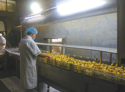 從孵化到養(yǎng)殖,從飼料到屠宰,榮達(dá)公司每個(gè)環(huán)節(jié)都嚴(yán)格控制,著力打造高質(zhì)量鴨肉品牌?!耙屜M(fèi)者吃得營養(yǎng)、吃得健康?!迸V峰說。在優(yōu)質(zhì)肉鴨新品種培育方面,榮達(dá)公司建成了標(biāo)準(zhǔn)化育種場,主要用于優(yōu)質(zhì)雙黑白羽肉鴨選育,實(shí)現(xiàn)孵化場——養(yǎng)殖戶——屠宰廠——飼料廠產(chǎn)業(yè)鏈運(yùn)作經(jīng)營模式,各個(gè)環(huán)節(jié)協(xié)同推進(jìn)。