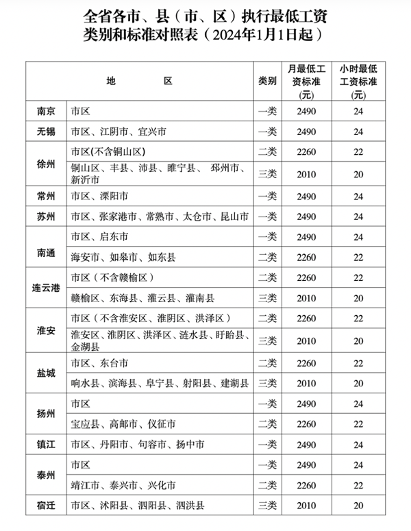 通知顯示,根據(jù)《最低工資規(guī)定》(原勞動保障部令第21號)和《江蘇省工資支付條例》規(guī)定,經(jīng)省人民政府同意,從2024年1月1日起調(diào)整全省最低工資標(biāo)準(zhǔn)。調(diào)整后,全省月最低工資標(biāo)準(zhǔn)為:南京、蘇州、無錫、常州、鎮(zhèn)江五市及南通市區(qū)、揚州市區(qū)、泰州市區(qū)等一類地區(qū)2490元;徐州市區(qū)(不含銅山區(qū))、連云港市區(qū)(不含贛榆區(qū))等二類地區(qū)2260元;宿遷全市等三類地區(qū)2010元。非全日制用工小時最低工資標(biāo)準(zhǔn):一類地區(qū)24元,二類地區(qū)22元,三類地區(qū)20元。