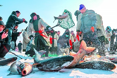 最激動人心的,當屬收網(wǎng)出魚的時刻。十幾名漁民排著隊將大網(wǎng)緩緩拉出,數(shù)千公斤的鯉魚、鰱魚、草魚相繼出水,活蹦亂跳的鮮魚在網(wǎng)中打著滾、撒著歡躍上冰面,異常壯觀。今年的冰下巨網(wǎng)捕魚迎來大豐收,當天,博斯騰湖新年冬季巨網(wǎng)捕魚第一網(wǎng)捕撈出6噸有機魚。