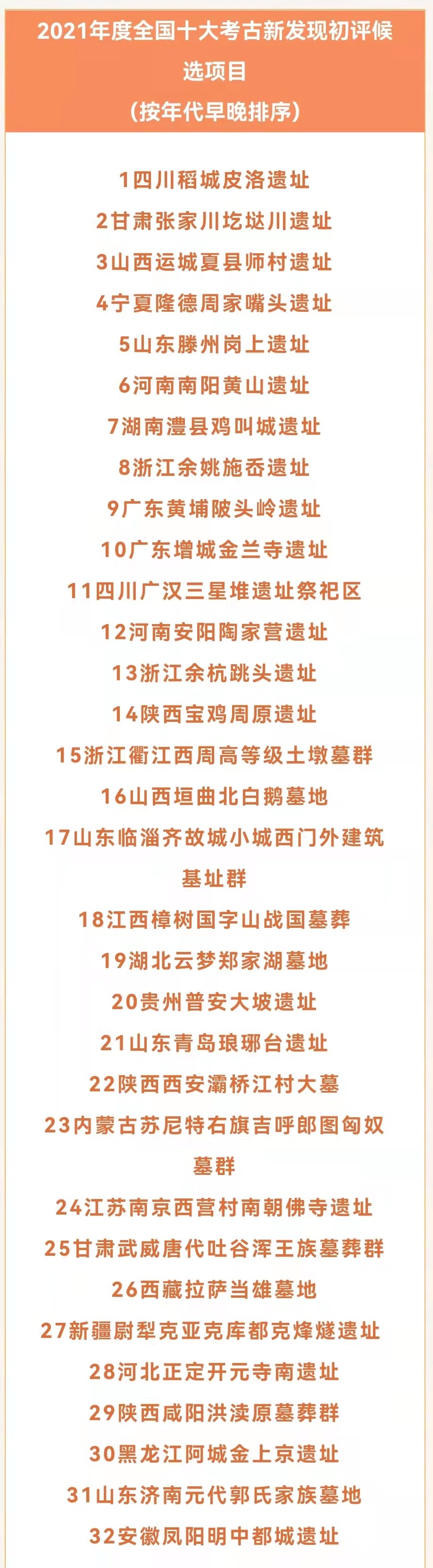 2021年,全國(guó)經(jīng)過(guò)審批的考古發(fā)掘1700余項(xiàng)。候選項(xiàng)目均為各發(fā)掘資質(zhì)單位主動(dòng)申報(bào),經(jīng)國(guó)家文物局審核,最終確定32項(xiàng)參評(píng)(名單如下)。評(píng)選活動(dòng)辦公室將組織投票推薦產(chǎn)生20項(xiàng)進(jìn)入終評(píng)。