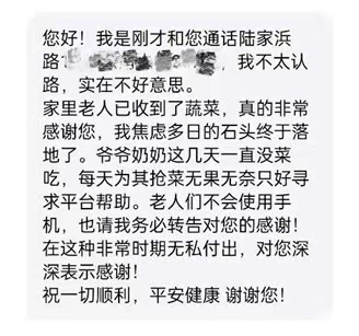 66歲的宋阿姨也是應(yīng)急特需保供通道的受益者。4月8日晚上,宋阿姨抱著試試看的態(tài)度,把個人信息和急需物資的情況傳到了“應(yīng)急特需”通道的平臺上,她回憶:“我把我的情況反映上去以后,他們真的積極地回應(yīng)了,馬上電話來聯(lián)系我核查情況。小姑娘問我,我也就實話實說了,我說我是一個躺在床上的罕見病患者,患有SMA(脊髓性肌萎縮癥),我的肌肉不行。小姑娘聽了我說的話,她的眼淚就出來了,我心里想我可能說得有點煽情了,后來小姑娘馬上就把這個情況反映上去,隔了一天就把菜送來了?!?/p>