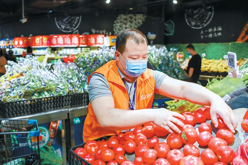 物美雙井店店長宋飛飛在賣場查看蔬果銷售情況。本報(bào)記者 鄧偉攝