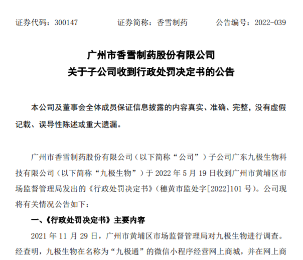 央廣網(wǎng)北京6月6日消息(記者 苗雁)近日,香雪制藥全資控股子公司廣東九極生物科技有限公司(以下簡(jiǎn)稱“九極生物”)因宣稱其果味飲品“天資韻膠原蛋白果味飲品”,能養(yǎng)顏?zhàn)o(hù)膚、豐滿胸部、預(yù)防疾病、預(yù)防骨質(zhì)疏松等,被廣州市黃埔區(qū)市監(jiān)局認(rèn)定涉嫌虛假宣傳,被處以罰款25萬(wàn)元。