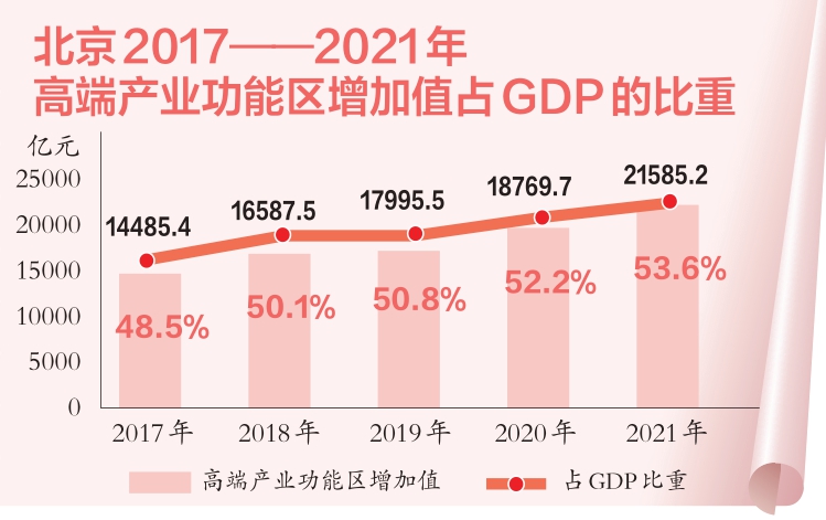 重點功能區(qū)呈現(xiàn)集聚效應。中關(guān)村國家自主創(chuàng)新示范區(qū)等高端產(chǎn)業(yè)功能區(qū)占據(jù)全市經(jīng)濟總量的半壁江山,2021年實現(xiàn)增加值2.2萬億元,占全市GDP的53.6%,比2016年提高5.3個百分點。