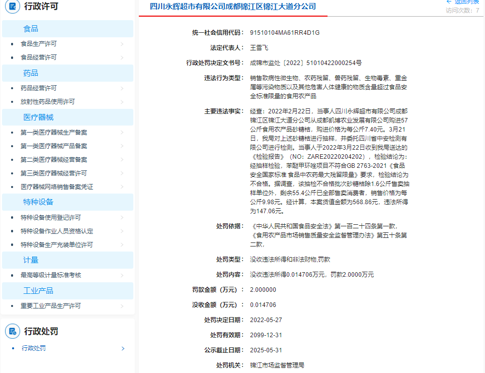 處罰決定文書顯示,經(jīng)查,2022年2月22日,當事人四川永輝超市有限公司成都錦江區(qū)錦江大道分公司從成都凱博農(nóng)業(yè)發(fā)展有限公司購進57公斤食用農(nóng)產(chǎn)品砂糖桔,購進價格為每公斤7.40元。當事人銷售的砂糖桔經(jīng)抽樣檢驗,苯醚甲環(huán)唑項目不符合GB 2763-2021《食品安全國家標準 食品中農(nóng)藥最大殘留限量》要求,檢驗結論為不合格。據(jù)調(diào)查,該抽檢不合格批次砂糖桔除1.6公斤售賣抽樣單位外,剩余55.4公斤已全部售賣消費者,銷售價格為每公斤9.98元。經(jīng)計算,本案貨值金額為568.86元,違法所得為147.06元。