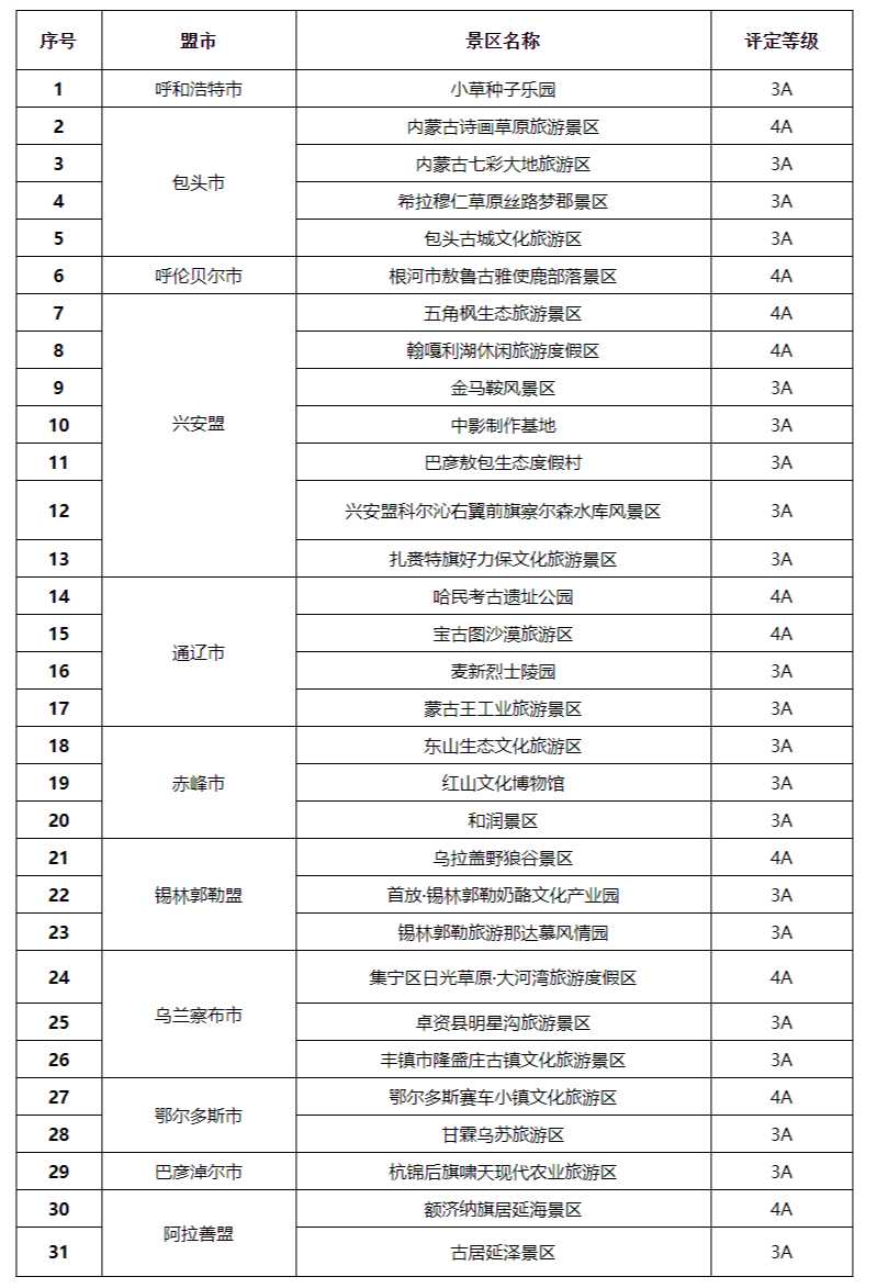 內(nèi)蒙古2022年擬確定國(guó)家4A級(jí)和3A級(jí)旅游景區(qū)共31家