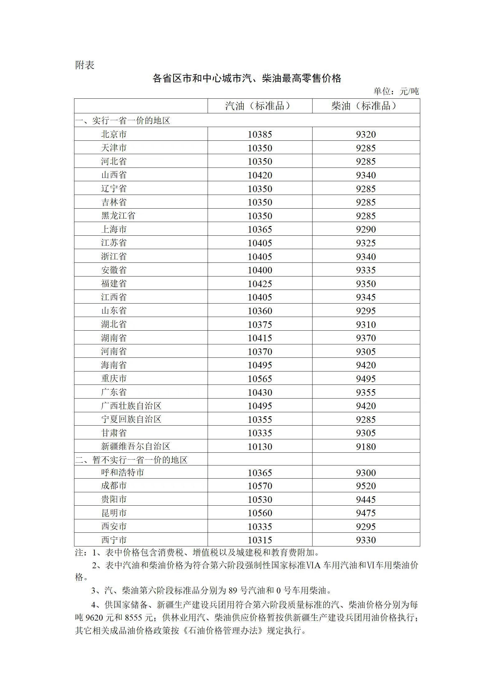 央廣網(wǎng)北京10月24日消息 據(jù)國家發(fā)展改革委官方網(wǎng)站消息,根據(jù)近期國際市場油價變化情況,按照現(xiàn)行成品油價格形成機制,自2022年10月24日24時起,國內(nèi)汽、柴油價格(標準品,下同)每噸分別提高185元和175元。調(diào)整后,各?。▍^(qū)、市)和中心城市汽、柴油最高零售價格見下表。相關(guān)價格聯(lián)動及補貼政策按現(xiàn)行規(guī)定執(zhí)行。