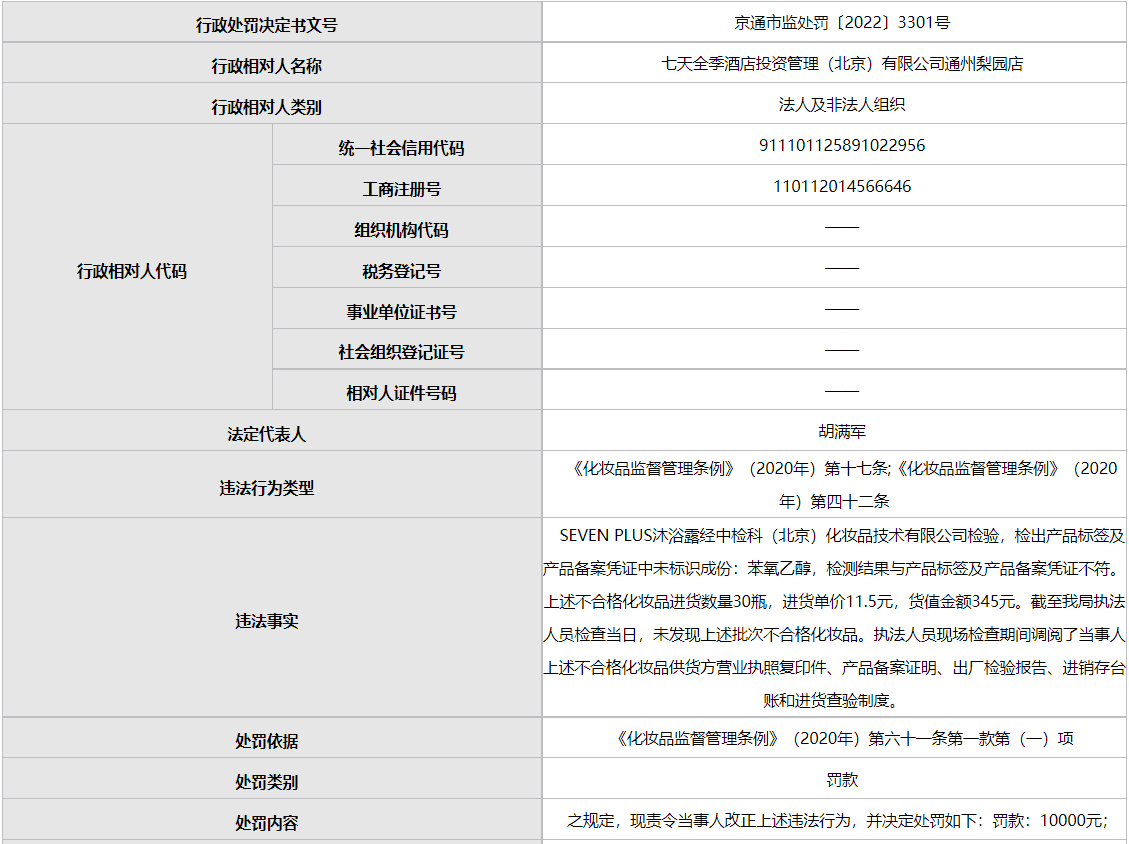 據(jù)文號(hào)為“京通市監(jiān)處罰〔2022〕3301號(hào)”行政處罰決定書(shū)顯示,七天酒店梨園店具體違法事實(shí)為:SEVEN PLUS沐浴露經(jīng)中檢科(北京)化妝品技術(shù)有限公司檢驗(yàn),檢出產(chǎn)品標(biāo)簽及產(chǎn)品備案憑證中未標(biāo)識(shí)成份:苯氧乙醇,檢測(cè)結(jié)果與產(chǎn)品標(biāo)簽及產(chǎn)品備案憑證不符。上述不合格化妝品進(jìn)貨數(shù)量30瓶,進(jìn)貨單價(jià)11.5元,貨值金額345元。