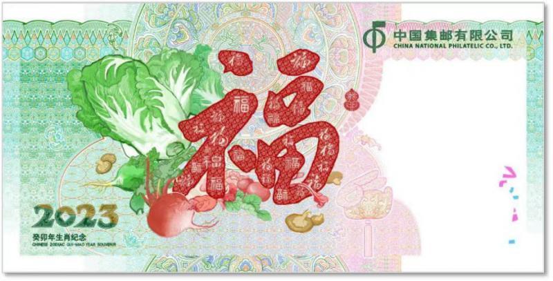 紀念券背面主景采用多個“?!弊值慕M合,寓意著新的一年福氣連連、福滿門。背景團花中有玉兔搗藥的圖案,表達了疫情之下祈求健康、幸福的真摯愿望。白菜、蘿卜、蘑菇也都有著各自的深意,比如白菜諧音“百財”,且有清白之意;蘿卜在閩南方言叫“菜頭”,諧音彩頭;蘑菇則象征蓬勃向上的生命力量。這些看似普通的元素給人以親切之感,更寓意著源源不斷的財運、好運和幸運。