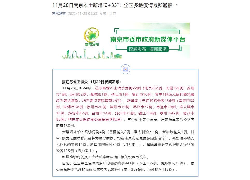 11月28日江蘇新增本土確診22例 新增本土無癥狀436例