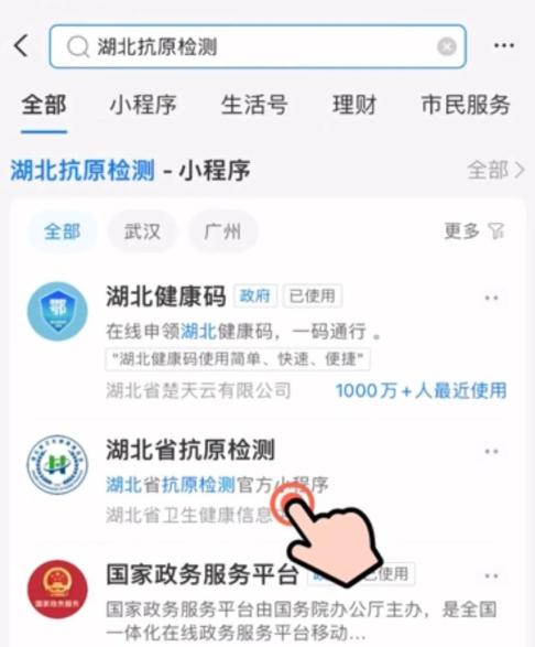 1.首先打開支付寶,搜索“湖北抗原檢測”,點擊“湖北省抗原檢測官方小程序”,進(jìn)入“個人檢測上報”。