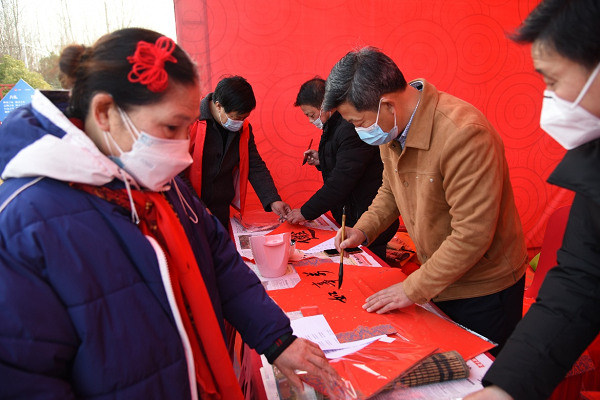 臺(tái)上歡歌載舞,臺(tái)下人頭攢動(dòng)。配鑰匙、法律援助咨詢、醫(yī)生義診、眼鏡修理等服務(wù),吸引了不少村民。書法家們現(xiàn)場書寫幾百幅福字,將新年的美好祝愿贈(zèng)予村民。