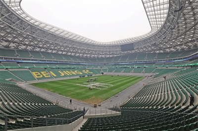 走進(jìn)新工體項(xiàng)目區(qū)域,清灰色外立面的工人體育場(chǎng)在陽(yáng)光下熠熠生輝,綠茵賽場(chǎng)整裝待發(fā),看臺(tái)上環(huán)繞著寫(xiě)有“北京國(guó)安”的綠色燈條。