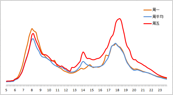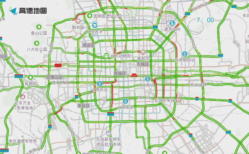 晚高峰期間,東、西、北二、三、四、五環(huán),東六環(huán)部分路段,以及萬泉河路至圓明園西路、通惠河北路、蓮石東路等城區(qū)道路出城方向車流集中,京藏高速、京承高速、京通快速、京港澳高速、機場高速等高速公路出京方向?qū)⒊霈F(xiàn)高峰車流,高峰時段為17:00—19:00,周五晚高峰提前且持續(xù)時間較長。