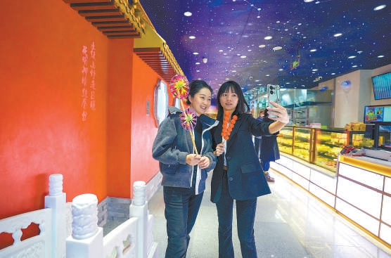 在位于朝外附近的北京稻香村零號店新店內(nèi),顧客在充滿古都元素的紅墻金瓦前打卡留影。 本報記者 武亦彬攝