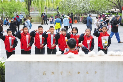 4月5日,陶然亭公園,西羅園第五小學(xué)的少先隊員們在高君宇烈士墓前重溫入隊誓詞。新京報記者 王嘉寧 攝