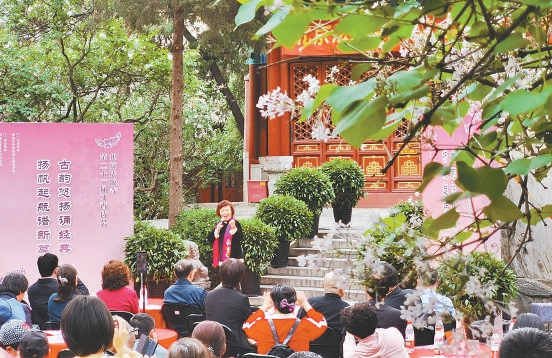 在10日的丁香詩會上,朗誦藝術(shù)家為觀眾帶來詩詞朗誦表演。本報(bào)記者 方非攝