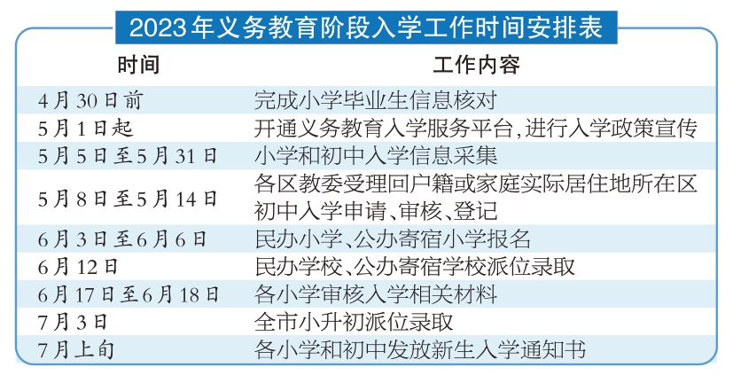 4月30日前,本市將完成小學畢業(yè)生信息核對;5月1日起,義務教育入學服務平臺開通,進行入學政策宣傳;5月5日至5月31日,進行小學和初中入學信息采集。