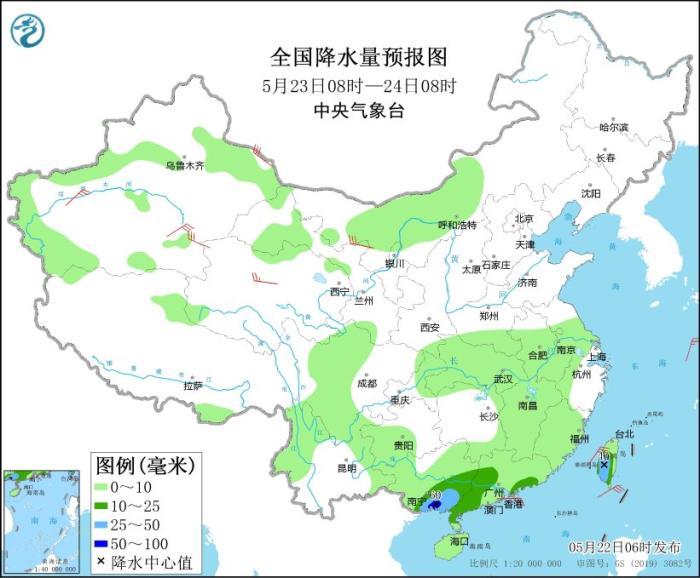 5月23日08時至24日08時,華南南部、臺灣島等地部分地區(qū)有中到大雨,其中,廣西東南部沿海等地部分地區(qū)有暴雨(50~60毫米)。新疆南疆盆地、青海北部、甘肅河西等地部分地區(qū)有4~6級風(fēng)。東海大部海域、臺灣海峽、臺灣以東洋面將有6~7級、陣風(fēng)8~9級的風(fēng)。