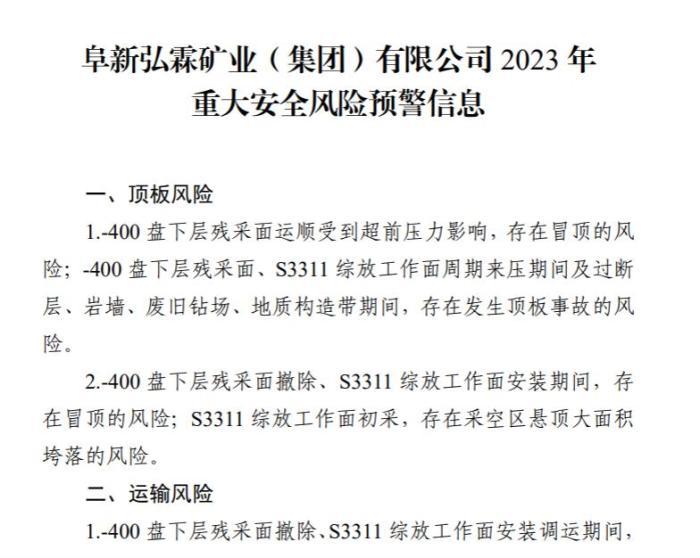 2021年2月,阜新市煤炭工業(yè)轉(zhuǎn)型發(fā)展局、遼寧煤監(jiān)局遼西監(jiān)察分局就曾發(fā)布2021年平安煤礦和弘霖煤礦重大安全風險預(yù)警信息,重大安全風險預(yù)判清單顯示,弘霖煤礦存在“超強度、超定員組織生產(chǎn)風險”“安全監(jiān)測監(jiān)控系統(tǒng)出現(xiàn)故障”等問題。