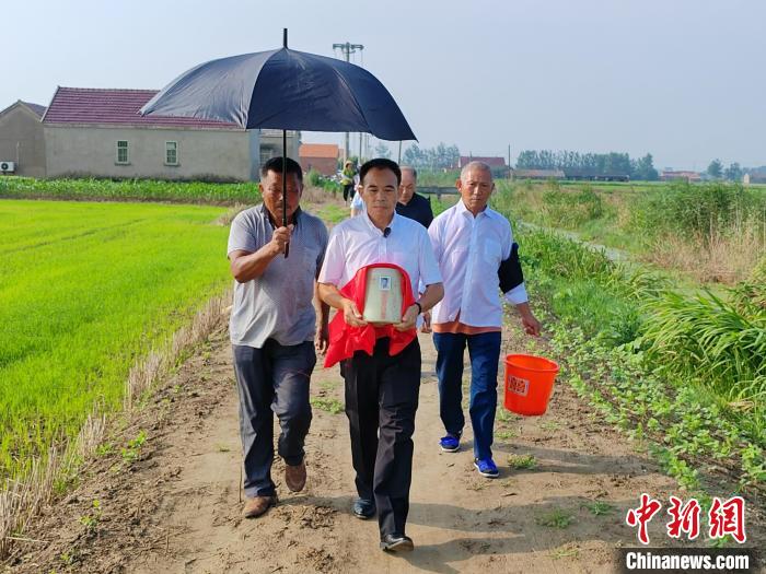 7月9日晨,劉德文手捧去臺老兵唐步良的骨灰,準備將其安葬在江蘇鹽城市射陽縣興橋鎮(zhèn)青華村青華公墓。這里是唐步良父母的長眠之地。 中新社記者 谷華 攝