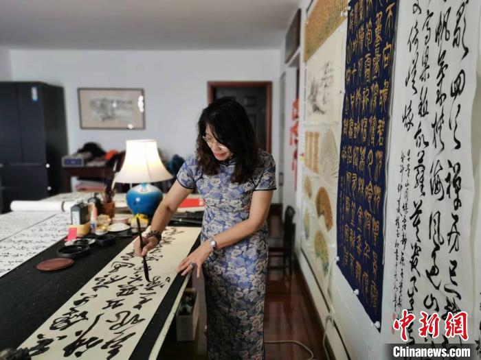 近日,楊玉如在書齋中練習書法?!≈行律缬浾?鐘升 攝