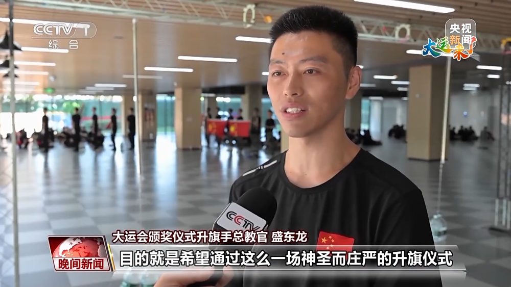 大運(yùn)會(huì)頒獎(jiǎng)儀式升旗手總教官 盛東龍:目的就是希望通過一場神圣而莊嚴(yán)的升旗儀式來感染他們,來激發(fā)和增強(qiáng)他們的愛國情懷和使命擔(dān)當(dāng)。