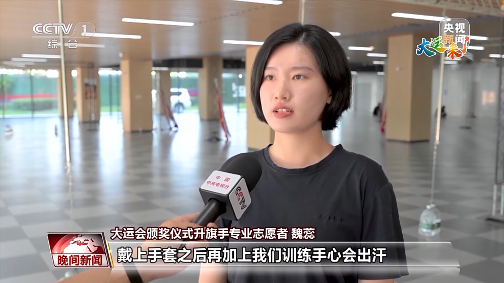 成都大運(yùn)會(huì)頒獎(jiǎng)儀式升旗手專業(yè)志愿者 魏蕊:戴上手套之后,再加上我們訓(xùn)練手心會(huì)出汗,對(duì)扣子還有旗的敏銳程度就會(huì)降低,很緊張,怕自己做不好拖團(tuán)隊(duì)的后腿。回去之后我就拿了一個(gè)類似的東西一直解、扣、解、扣,重復(fù)練。成百上千次肯定是有的。