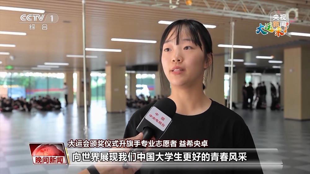 大運(yùn)會(huì)頒獎(jiǎng)儀式升旗手專業(yè)志愿者 益希央卓:要心里有信念才能把這件事做好。向世界展現(xiàn)我們中國大學(xué)生更好的青春風(fēng)采。
