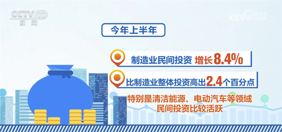 國家發(fā)展改革委相關(guān)負(fù)責(zé)人表示,當(dāng)前,民間投資結(jié)構(gòu)持續(xù)優(yōu)化,一些領(lǐng)域民間投資顯現(xiàn)了不少亮點(diǎn)。今年上半年,除房地產(chǎn)開發(fā)以外的民間投資同比增長9.4%,增速比全部投資高5.6個(gè)百分點(diǎn);制造業(yè)民間投資增長8.4%,比制造業(yè)整體投資高出2.4個(gè)百分點(diǎn),特別是清潔能源、電動(dòng)汽車等領(lǐng)域民間投資比較活躍;基礎(chǔ)設(shè)施民間投資增長15.6%,比基礎(chǔ)設(shè)施整體投資高出8.4個(gè)百分點(diǎn),呈現(xiàn)出較強(qiáng)的投資信心和投資動(dòng)力。