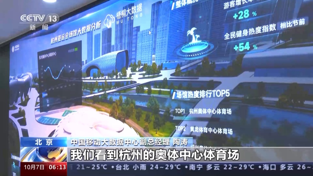 中國移動(dòng)大數(shù)據(jù)中心副總經(jīng)理 陶濤:前往亞運(yùn)會(huì)主要舉辦城市的游客的數(shù)量相比節(jié)前一周日均增幅超過28%,主要是來自長三角地區(qū)以及津京冀等地區(qū)。根據(jù)我們對于線上訂票以及搜索這些數(shù)據(jù)的分析,我們看到杭州的奧體中心體育場、黃龍?bào)w育中心體育場以及紹興奧體中心體育館這三個(gè)場館是最熱的體育場館。