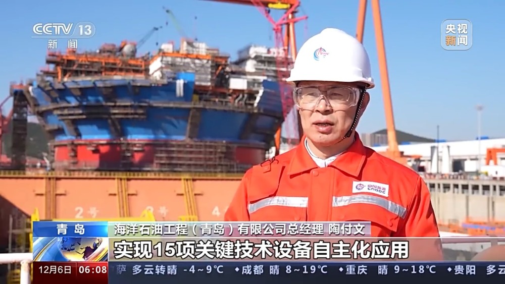 海洋石油工程(青島)有限公司總經(jīng)理 陶付文:創(chuàng)新采用一體化建造工藝和雙龍門(mén)吊集成技術(shù),實(shí)現(xiàn)15項(xiàng)關(guān)鍵技術(shù)設(shè)備自主化應(yīng)用,使我國(guó)具備了根據(jù)不同油田、不同海域,自主設(shè)計(jì)制造不同類型深水油氣裝備的能力。
