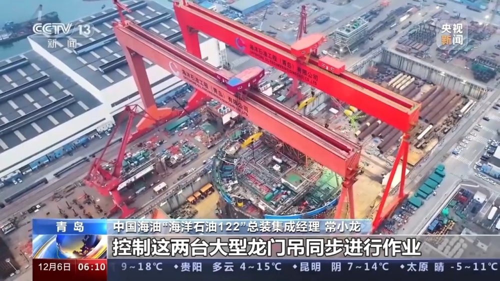 中國(guó)海油“海洋石油122”總裝集成經(jīng)理 常小龍:我們是通過(guò)數(shù)字化系統(tǒng),控制這兩臺(tái)大型龍門(mén)吊同步進(jìn)行作業(yè),創(chuàng)新采用了插尖輔助定位技術(shù),插尖都在每個(gè)模塊下部,每個(gè)都有十幾個(gè)插尖,我們最終給它的定位精度控制在了4毫米以內(nèi),我們這樣的方式也加快了整體作業(yè)效率,平均每?jī)商斓跻粋€(gè)模塊,整體作業(yè)效率提高了50%以上。