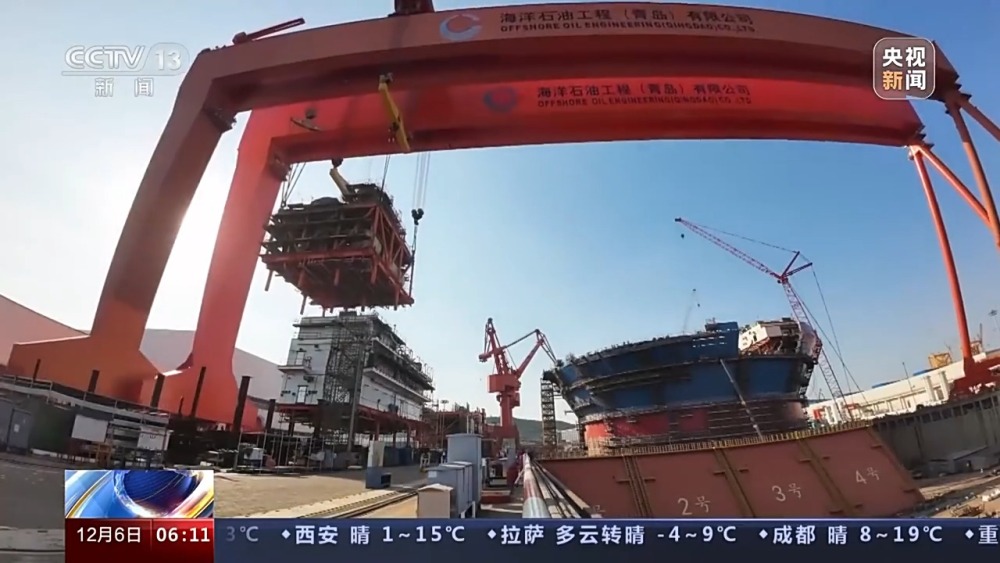 總臺(tái)央視記者 張叢婧:這里是青島海洋工程高新裝備制造基地,隨著現(xiàn)場(chǎng)最后一個(gè)模塊吊裝就位,意味著經(jīng)過(guò)20個(gè)月的施工,這個(gè)集原油生產(chǎn)、存儲(chǔ)、外輸?shù)裙δ苡谝惑w的新型“海上油氣加工廠”主體結(jié)構(gòu)建造完工,進(jìn)入集成調(diào)試階段。