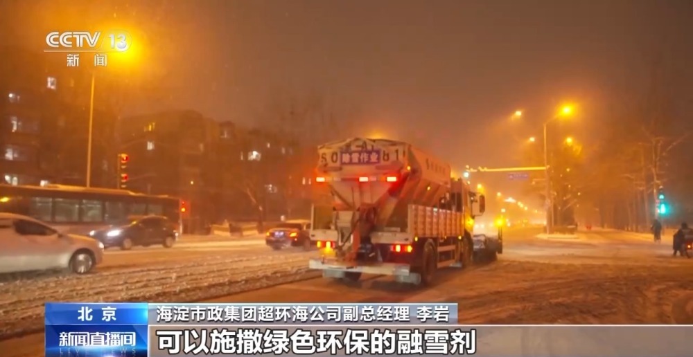 海淀市政集團超環(huán)海公司副總經(jīng)理 李巖:通過人機配合的工作模式,縮短道路恢復的時間。大型的機械設備,主要是多功能除雪車,前面有滾刷,可以將雪打碎,后面有撒布設備,可以施撒綠色環(huán)保的融雪劑。