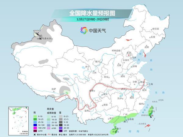 后天,新疆北部和南疆西部山區(qū)、西藏東部等地部分地區(qū)有小到中雪或雨夾雪,其中,新疆伊犁河谷等地部分地區(qū)有大雪。華南南部、海南島、臺(tái)灣島等地部分地區(qū)有小到中雨,局地有大雨。